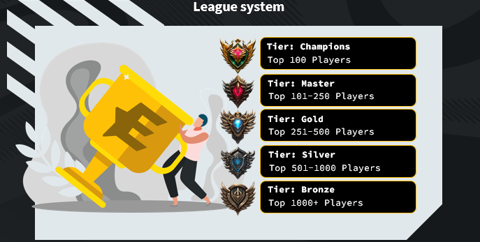 League system: - Based on your number of points, you automatically qualify in a Tier. - Every tier has a specific number of players and 20% of the reward pool assigned to them. - If the number of players doesn't complete all the tiers the percentage adjusts according to that number.