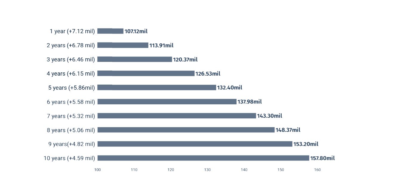 At 10 years, supply will be at 63.12% from the ceiling.